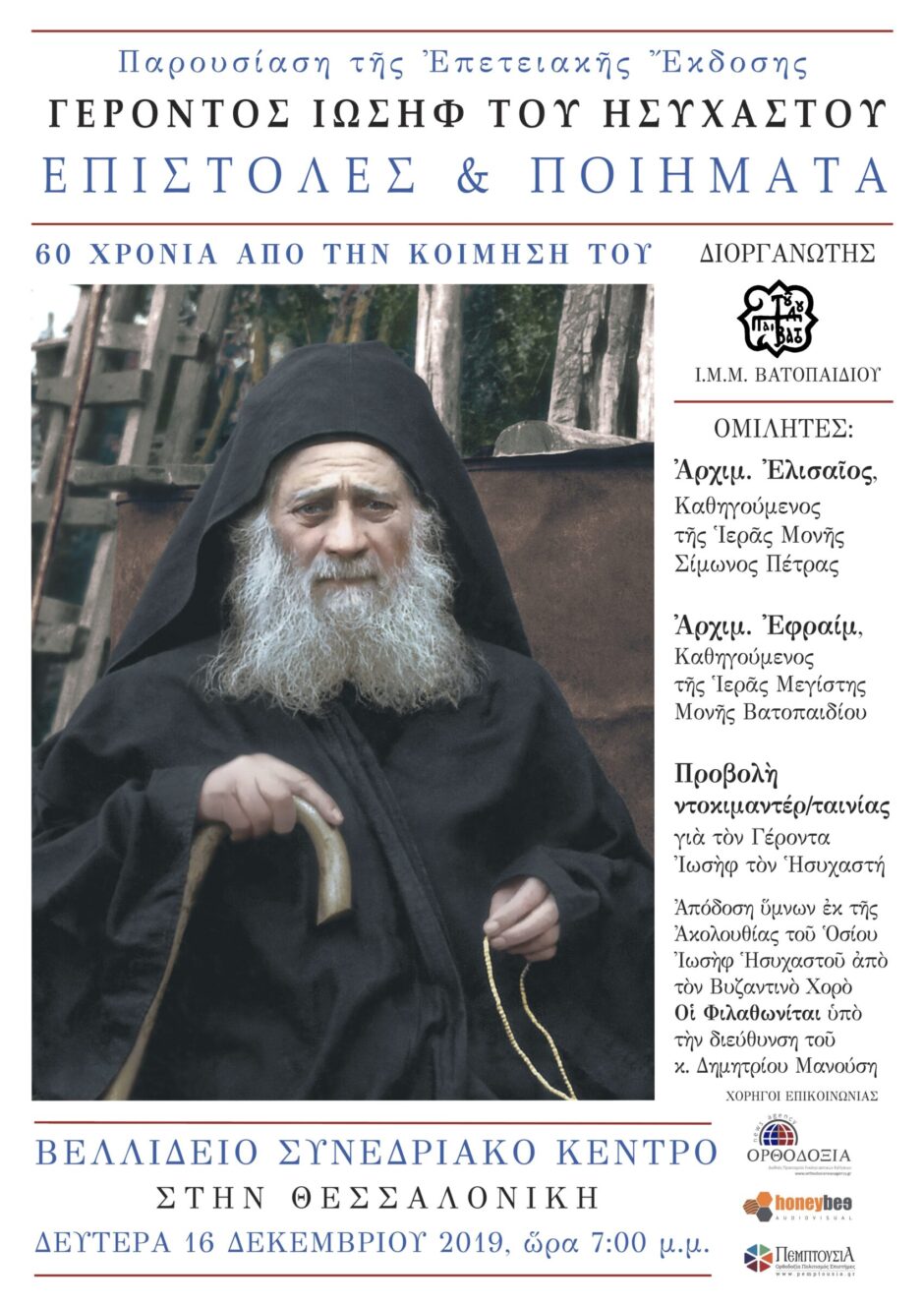 Με την ευκαιρία της επετειακής εκδόσεως της Ιεράς Μεγίστης Μονής Βατοπαιδίου, Γέροντος Ιωσήφ του Ησυχαστού, «Επιστολές και Ποιήματα (60 χρόνια από την κοίμηση του)»,η Μονή Βατοπαιδίου διοργανώνει για την παρουσίαση της νέας αυτής εκδόσεως εκδήλωση, η οποία θα πραγματοποιηθεί την Δευτέρα 16 Δεκεμβρίου 2019 και ώρα 7:00 μ.μ. στην Θεσσαλονίκη στο Βελλίδειο Συνεδριακό Κέντρο. Ο μακάριος Γέροντας Ιωσήφ ο Ησυχαστής (1897-1959) έζησε σε μία περίοδο κρίσης και λειψανδρίας του Αγιορειτικού μοναχισμού.Επανέφερε με τον εμπειρικό τρόπο ζωής του ξανά την διδασκαλία του Αγίου Γρηγορίου Παλαμά περί ησυχασμού στον σύγχρονο αγιορειτικό και εν γένει στον ορθόδοξο μοναχισμό. Ήταν ένας άξιος συνεχιστής της ησυχαστικής και φιλοκαλικής παραδόσεως, που συνέβαλε τα μέγιστα στην πνευματική άνθηση και επάνδρωση του Αγίου Όρους. Υπολογίζεται ότι από την «ρίζα» ...