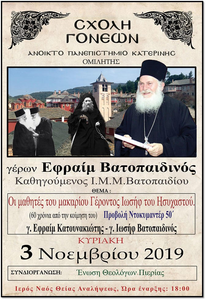 Την Κυριακή 3 Νοεμβρίου στον Ι.Ν. Θείας Αναλήψεως Κατερίνης στις 18:00 ο Καθηγούμενος της Ιεράς Μεγίστης Μονής Βατοπαιδίου Γέρων Εφραίμ θα μιλήσει για τους μαθητές του Γέροντα Ιωσήφ του Ησυχαστού, τον παπά Εφραίμ Κατουνακιώτη και τον Γέροντα Ιωσήφ Βατοπαιδινό με αφορμή τα 60 χρόνια από την κοίμηση του και την πρόσφατη αγγελία του Πατριάρχη Κωνσταντινουπόλεως για την Αγιοκατάταξη του Γέροντα Ιωσήφ Ησυχαστού και παπά Εφραίμ Κατουνακιώτη. Στην έναρξη της εκδήλωσης θα προβληθεί 50λεπτο βίντεο παραγωγής του Ινστιτούτου Άγιος Μάξιμος ο Γραικός. Η εκδήλωση γίνεται σε συνδιοργάνωση με την Ένωση Θεολόγων Πιερίας.