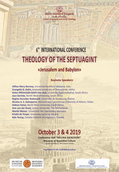 Το 6ο Διεθνές Θεολογικό Συνέδριο με θέμα τη θεολογία των Εβδομήκοντα (Ο΄) και τίτλο «Ιερουσαλήμ και Βαβυλώνα» θα διεξαχθεί στο Μουσείο Βυζαντινού Πολιτισμού στις 3-4 Οκτωβρίου 2019. Πρόκειται για μία συνδιοργάνωση του Τμήματος Ποιμαντικής και Κοινωνικής Θεολογίας του Α.Π.Θ. και του Μουσείου Βυζαντινού Πολιτισμού.