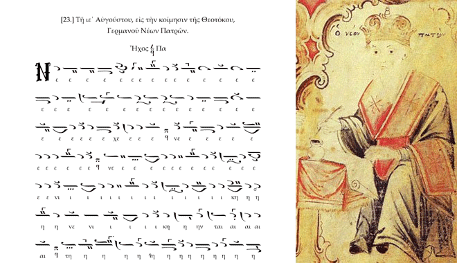 Ο Κυριάκος Τζουραμάνης, Λαμπαδάριος του Ιερού Ναού Παντανάσσης Πατρών ερμηνεύει το μάθημα του αργού καλοφωνικού είδους «Νενίκηνται της φύσεως οι όροι», σε μέλος Γερμανού Νέων Πατρών.