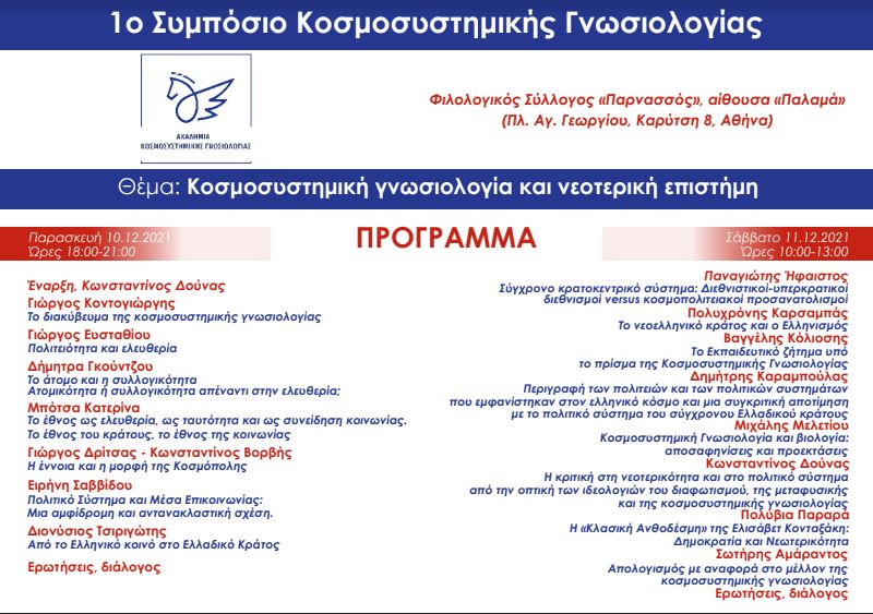 Η Ακαδημία Κοσμοσυστημικής Γνωσιολογίας σε συνεργασία με το Φ.Σ. «Παρνασσός» διοργανώνουν Επιστημονικό Συμπόσιο με θέμα: “Κοσμοσυστημική Γνωσιολογία και νεοτερική επιστήμη”,...