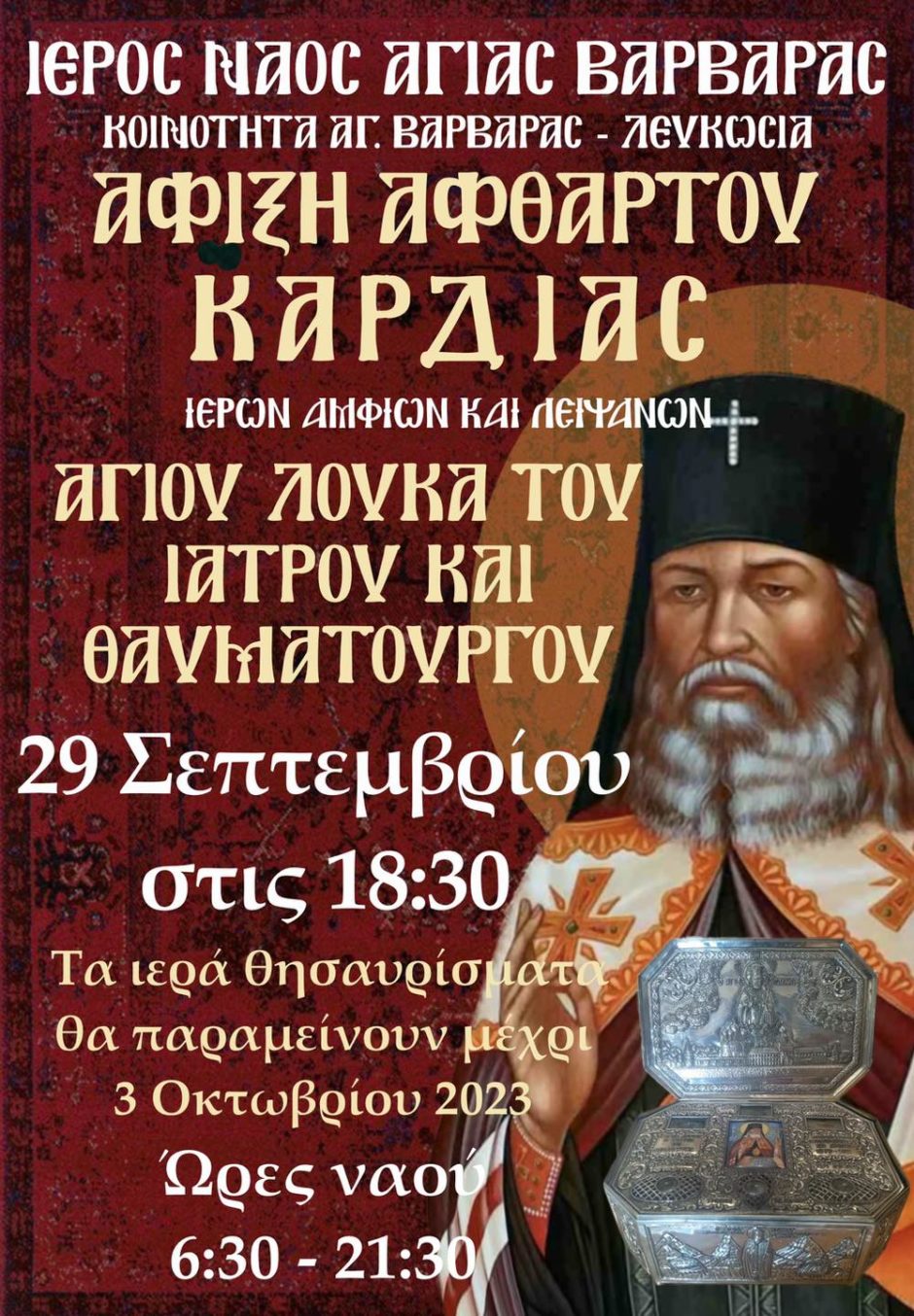 Η Επιτροπή ανεγέρσεως του Ιερού Ναού Αγίου Λουκά του Ιατρού στην Κοινότητα Αγίας Βαρβάρας της Επαρχίας Λευκωσίας ανακοινώνει την έλευση της αφθάρτου...