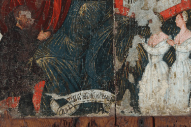 Είναι πλαισιωμένη από το εντυπωσιακό παλάτι του βασιλιά Ηρώδη αλλά και τον αρχάγγελο Γαβριήλ που προσφέρει τον κρίνο στην Παναγία....