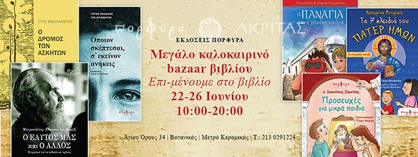 Oι εκδόσεις Πορφύρα και Ακρίτας διοργανώνουν Bazaar βιβλίου Από Δευτέρα 22 έως την Παρασκευή 26 Ιουνίου Το καλοκαίρι είναι κιόλας...