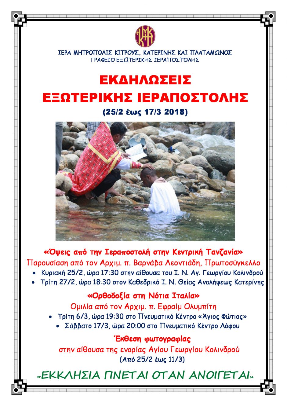 Tην Κυριακή 25 Φεβρουαρίου ξεκινούν οι εκδηλώσεις που διοργανώνει το Γραφείο Εξωτερικής Ιεραποστολής της Ιεράς Μητρόπολης Κίτρους, Κατερίνης και Πλαταμώνος...