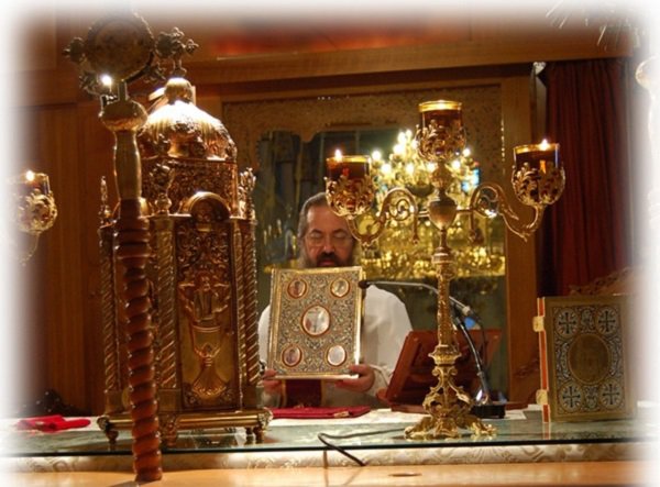 The beginning and the Litany of Peace The priest lifts up the Gospel, makes the sign of the cross with it over the altar and says in a loud voice: ‘Blessed is the Kingdom of the Father, and of the Son, and of the Holy Spirit, now and for ever and to the ages of ages’. The choir, or the people, reply ‘Amen’- (May it be so). Then the priest- or the deacon if there is one- begins to say the Litany of Peace. He encourages us to pray to God with the words: ‘In peace let us pray to the Lord’, and we submit our supplications regarding our salvation and also our everyday life. We entreat God to grant us health, ...