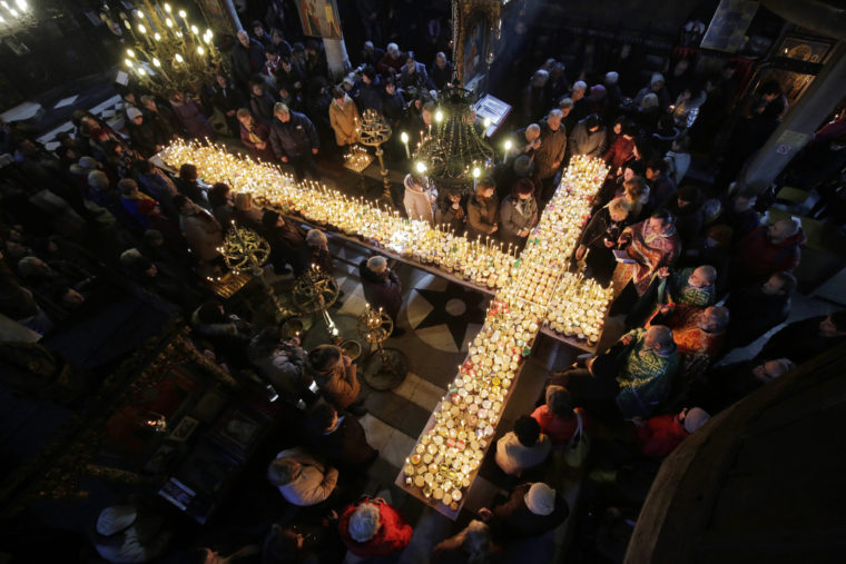 SOFIA, Bulgaria – Worshippers gather around candles stuck to jars of honey, arranged as a cross, during mass for the...