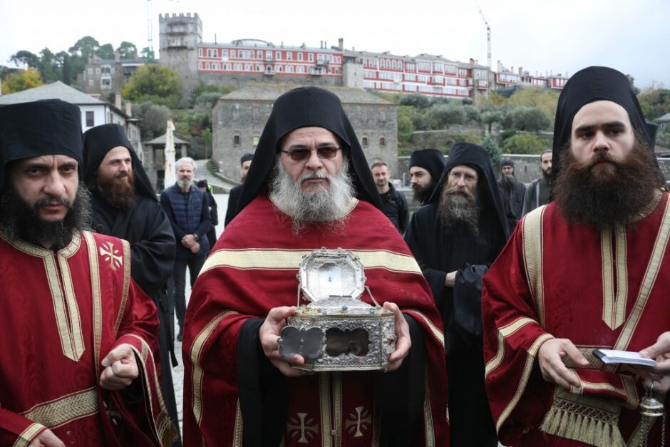 A reliquary containing the skull of St. John Chrysostom, kept at the Holy and Great Monastery of Vatopedi, was conveyed...
