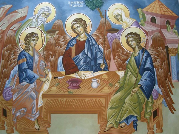 B) THE HOLY ICON OF HOSPITALITY OF ABRAHAM Also whoever studies, from the Old Testament, the chapter of hospitality of ABRAHAM, he will make sure that the Patriarch in his tent provides hospitality to God and two built angels. He who wants to have more secure and reliable interpretations about the content of hospitality as soon as he goes deeper into the Fatherly bibliography he will soon reach the conclusion that the overwhelming majority of the Holy Fathers ascertain exactly the same as a simple reader understands. The God is the focal person and the two angels are seated at Abraham’s table. The misunderstanding, which was given to hospitality and which tends to become dominant, that Abraham provides hospitality to the Holy Trinity, ...