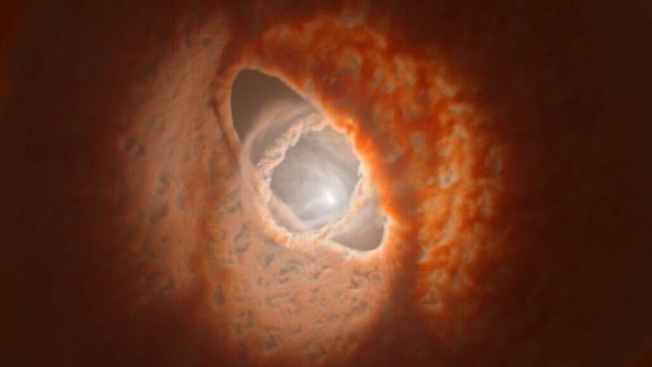 Η κολοσσιαία μαύρη τρύπα, βρίσκεται 2,7 δισεκατομμύρια έτη φωτός από τη Γη στον λαμπρότερο γαλαξία του σμήνους γαλαξιών Abell 1201...