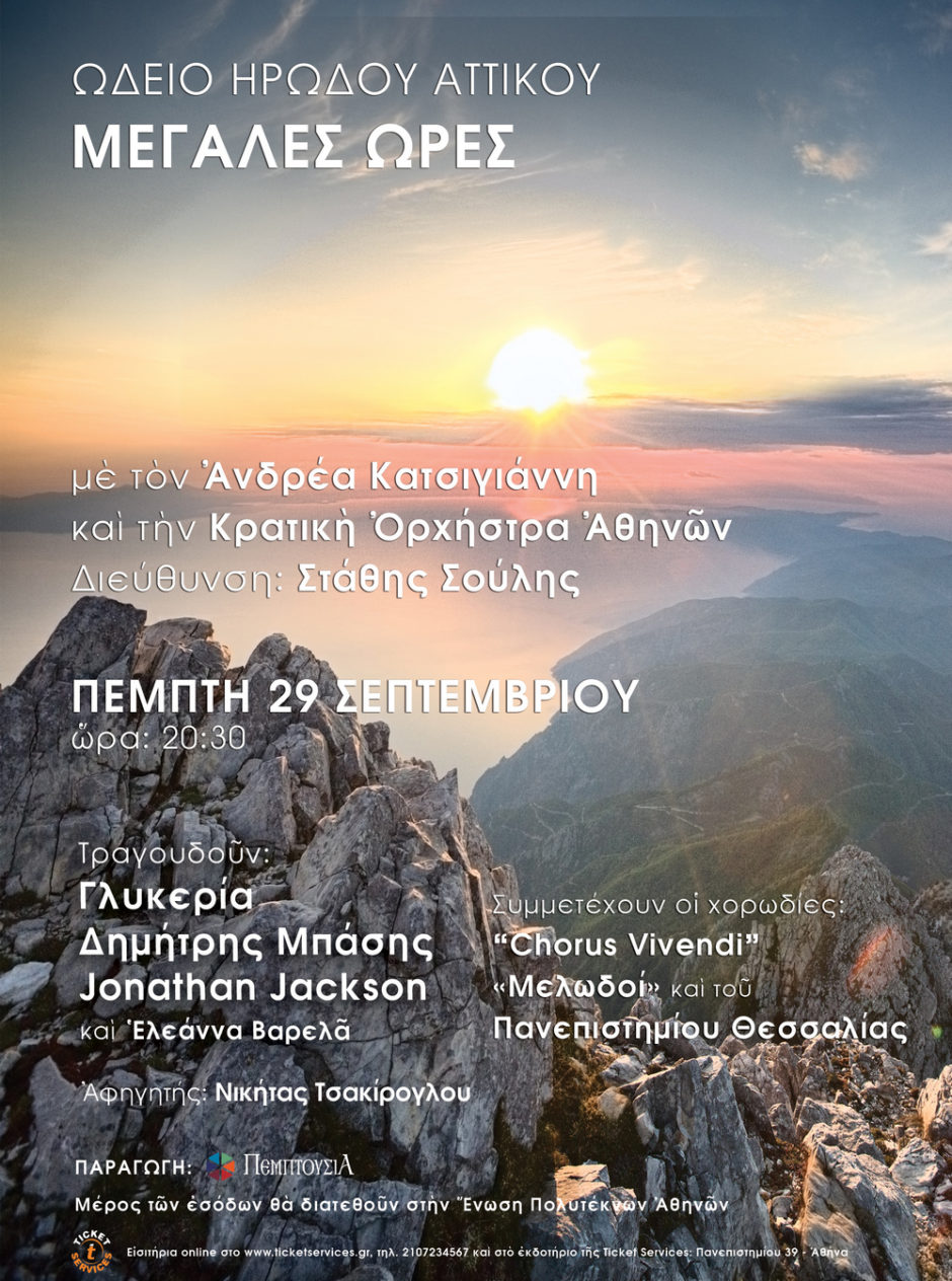 Με ιδιαίτερη επιτυχία πραγματοποιήθηκε σήμερα, Πέμπτη 29 Σεπτεμβρίου 2022 το πολυδιάστατο μουσικό έργο «ΜΕΓΑΛΕΣ ΩΡΕΣ» στο Ηρώδειο. Ο συνθέτης Ανδρέας...