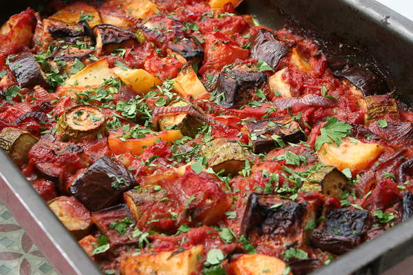 Υλικά 3 μελιτζάνες 3 κολοκυθακια 4 πατάτες 1 κούπα φρέσκια σάλτσα ντομάτας 2 πιπεριές κόκκινες 1 πιπεριά πράσινη 1 κρεμμύδι...