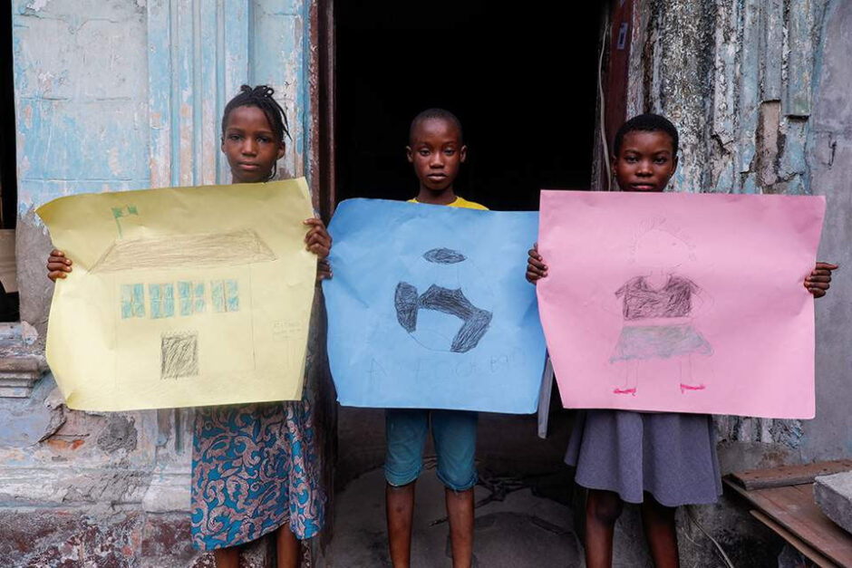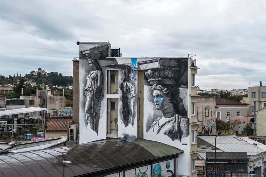 Φωτογραφία που δόθηκε στη δημοσιότητα το Σάββατο 27 Ιανουαρίου 2024 και εικονίζει την τοιχογραφία μεγάλης κλίμακας «Καρυάτιδες που κλαίνε» του...
