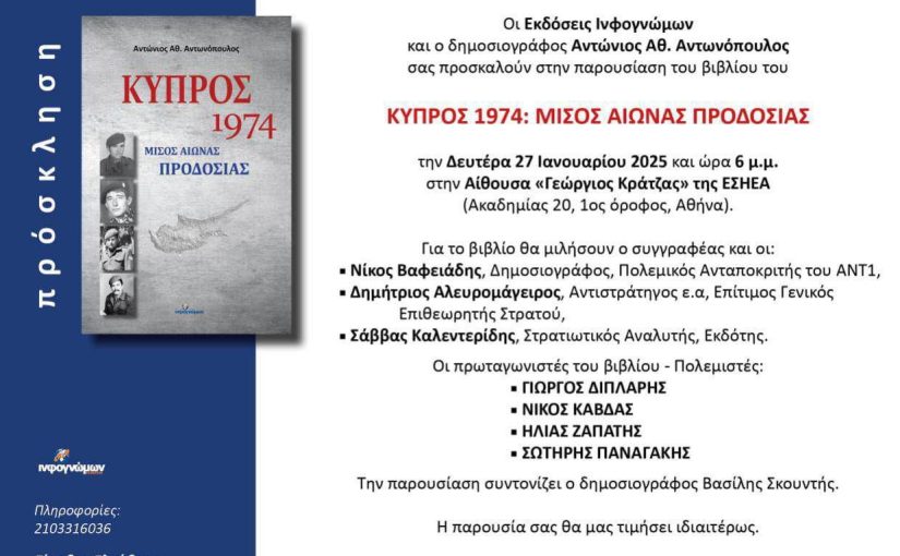 ΑΘΗΝΑ. Το βιβλίο του «Κύπρος 1974: Μισός Αιώνας προδοσίας» (Εκδόσεις Ινφογνώμων) παρουσιάζει τη Δευτέρα στην Αίθουσα Γεώργιος Καράτζας της ΕΣΗΕΑ...