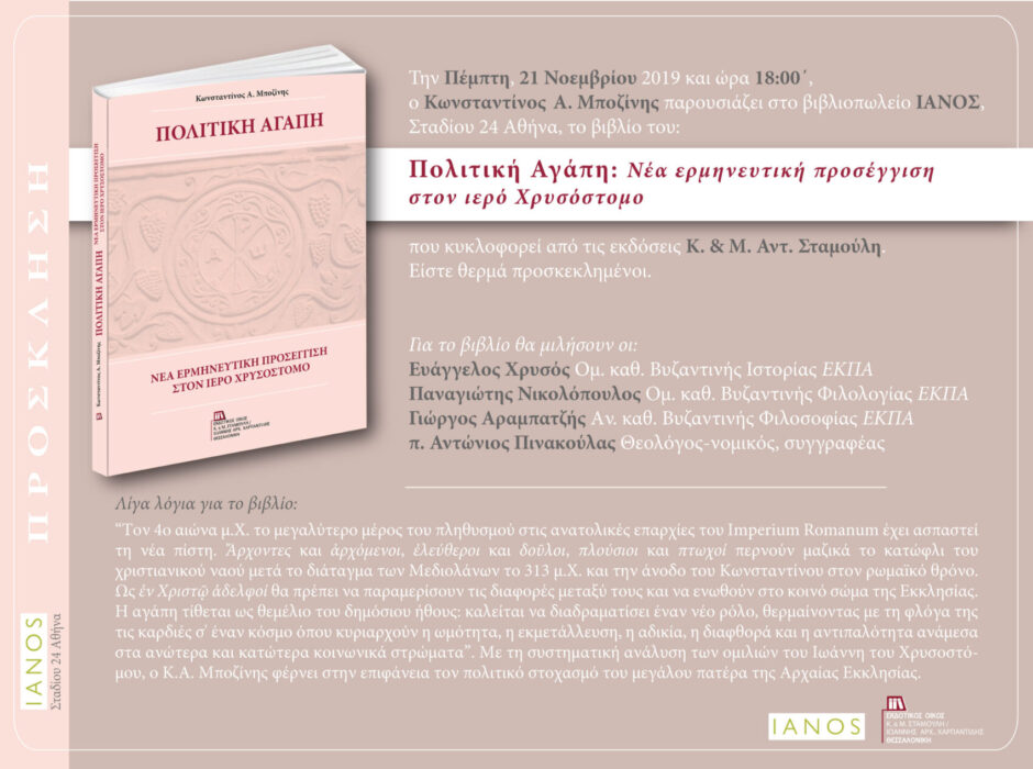 Ο Κωνσταντίνος Μποζίνης παρουσιάζει στον απόψε στο βιβλιοπωλείο IANOΣ της Αθήνας (Σταδίου 24), στις 18:00, το βιβλίο του “Πολιτική Αγάπη:...