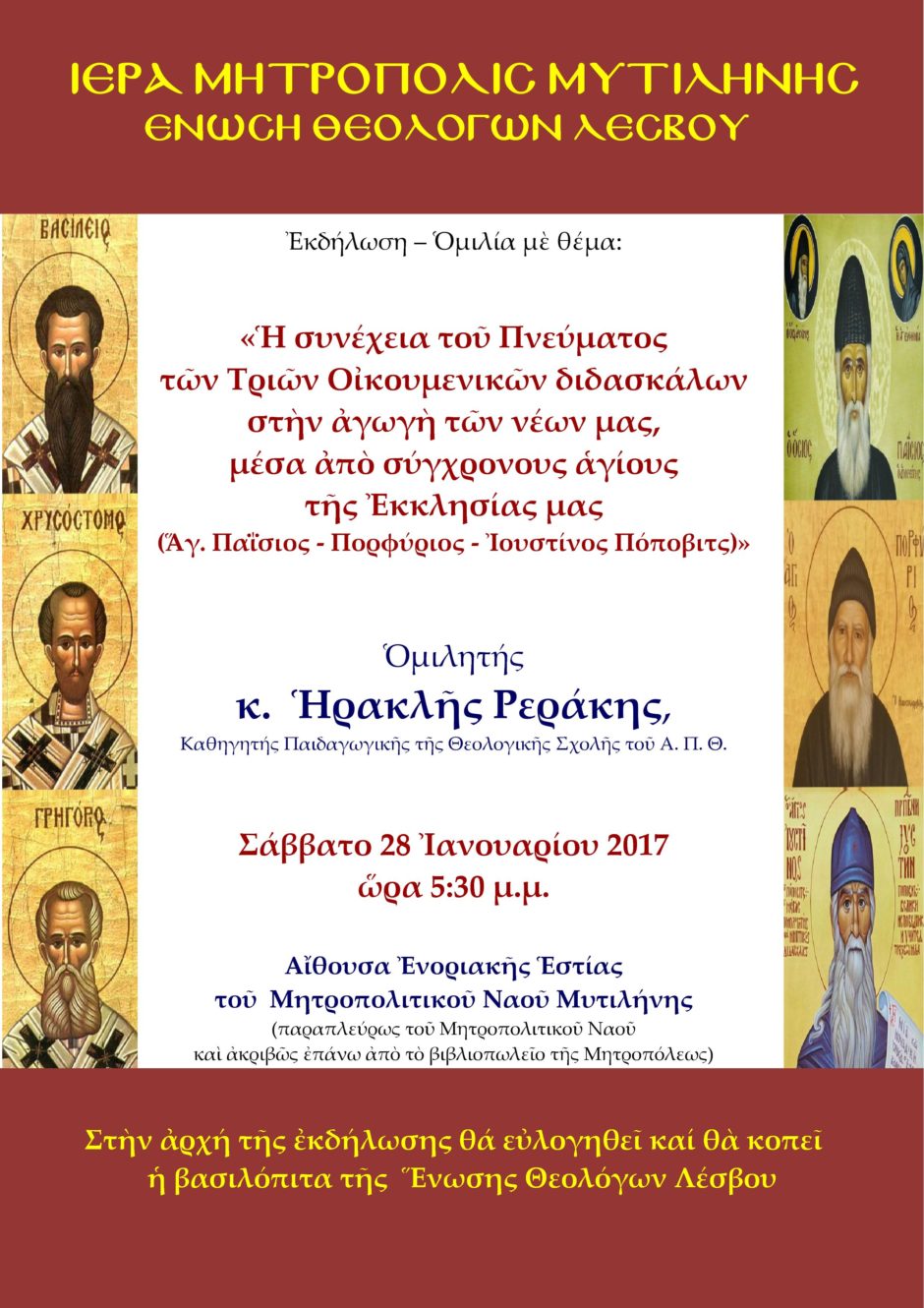 Η Ιερά Μητρόπολις Μυτιλήνης και η Ένωση Θεολόγων Λέσβου διοργανώνουν εκδήλωση – ομιλία, το Σάββατο 28 Ιανουαρίου 2017 και ώρα...