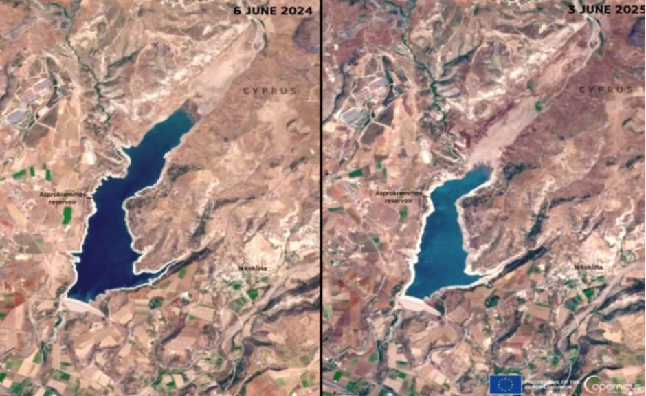 ΛΕΥΚΩΣΙΑ. Σε εικόνες από τον δορυφόρο Sentinel-2 του ευρωπαϊκού προγράμματος Copernicus αποτυπώνεται σημαντική μείωση της στάθμης των υδάτων στο φράγμα...