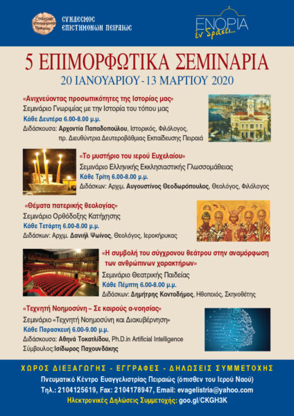 Το πρόγραμμα «ΕΝΟΡΙΑ εν δράσει» του Ιερού Ναού Ευαγγελίστριας Πειραιώς και ο Σύνδεσμος Επιστημόνων Πειραιώς διοργανώνουν και τη φετινή χρονιά...