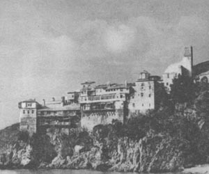 Ιερά Μονή Γρηγορίου (φωτ. 1928) Καταγόταν από το νησί της Μεγαλόχαρης Παναγίας, την Τήνο των Κυκλάδων. Διετέλεσε παροικονόμος του μετοχίου της μονής στη Βούλτσιστα Πιερίας. Μαζί με τον παραδελφό του Γέροντα Συμεών (+1901) συκοφαντήθηκε για ανηθικότητες, αυτός ο βράχος της ηθικής, όπως αναφέρει το μοναχολόγιο. Έτσι είχε το ίδιο δεινό πάθημα με τον προαναφερθέντα. Τοποθετήθηκε δίχως τη θέλησή του σ’ ένα ξεσαμάρωτο ονάριο με την πλάτη μπροστά, και περιεφέρετο δεχόμενος ειρωνείες, εμπαιζόμενος και χλευαζόμενος από διαφόρους. Η θεία δίκη ενήργησε τον παραδειγματισμό των υπολοίπων με το οικτρό τέλος των δεινών συκοφαντών. Μάλιστα ήταν και ένας δόκιμος μοναχός κι ένας εργάτης των κτημάτων της μονής, που είχε βοηθηθεί μαζί με την οικογένειά του. Είχαν και οι δύο οδυνηρό τέλος, για τη ...