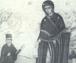 Η εξεικόνιση του θαύματος της Γερόντισσας Παναγίας στον μοναχό Πανάρετο. Ο κατά κόσμον Παντελεήμων Βασιλειάδης γεννήθηκε στην Προύσα της Μ. Ασίας το 1901. Στην ιερά μονή Παντοκράτορος προσήλθε το 1938 κι εκάρη μοναχός το επόμενο έτος. Ανεπαύθη εν Κυρίω στις 28.10.1969. Αυτά τα λίγα αναφέρει το μοναχολόγιο της μονής του γι’ αυτόν. Οι άνθρωποι που τον γνώρισαν τον περιγράφουν ψηλό, λιπόσαρκο, ρυτιδωμένο, σκληραγωγημένο, του οποίου το βλέμμα, η ιλαρότητα του προσώπου και τα μετρημένα λόγια του, τους προβλημάτιζαν. Τον είχαν για ελαφρόμυαλο οι παλαιοί Παντοκρατορινοί και μόνο για θελήματα. Τον θεωρούσαν υπαίτιο της φωτιάς, που έκαψε το 1948 μία ωραία πτέρυγα της μονής. Δεν χρησιμοποιούσε ποτέ ζώο. Καθημερινά πήγαινε κι ερχόταν φορτωμένος στις Καρυές, μεταφέροντας την αλληλογραφία και ό,τι άλλο του ...