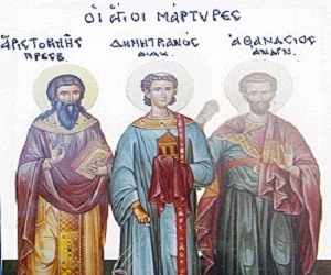 Οι τρεις Κύπριοι άγιοι έζησαν κατά το μεγάλο διωγμό του Διοκλητιανού (αρχές 4ου αι.). Αρχικά, ο πρεσβύτερος Αριστοκλής δεν θέλησε να συμμετάσχει στο μαρτύριο, διότι πίστευε ότι έπρεπε να βοηθήσει πνευματικά το ποίμνιό του. Κρύφτηκε, λοιπόν, μέσα σε μια απόκρημνη σπηλιά ενός βουνού. Από το κρησφύγετό του όμως πληροφορήθηκε ότι στα αστικά κέντρα ο χριστιανικός πληθυσμός έσπευδε πρόθυμα να προσφέρει τη ζωή του για τη χριστιανική πίστη. Ο Αριστοκλής μετανόησε για τη στάση του και θεώρησε ότι προσβάλλει το σχήμα του η φυγή του, τη στιγμή που οι εν Χριστώ αδελφοί του έδιναν τη μαρτυρία της αληθινής πίστης. Αποφάσισε έτσι να οπλιστεί με θάρρος και να κατέβει στην πόλης της Σαλαμίνας (της Κύπρου). Εκεί βρήκε μέσα στο ναό να προσεύχονται ο διάκονος Δημητριανός (ή ...