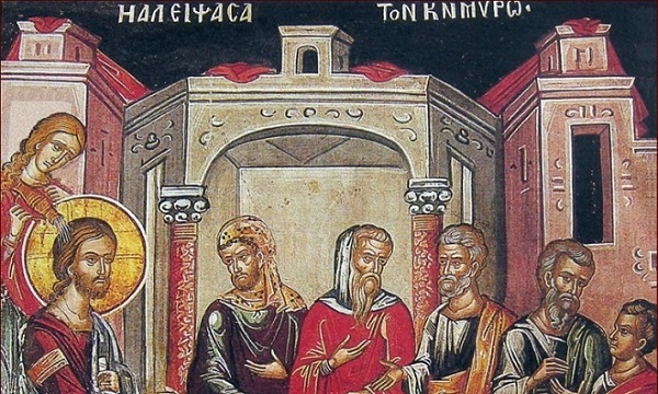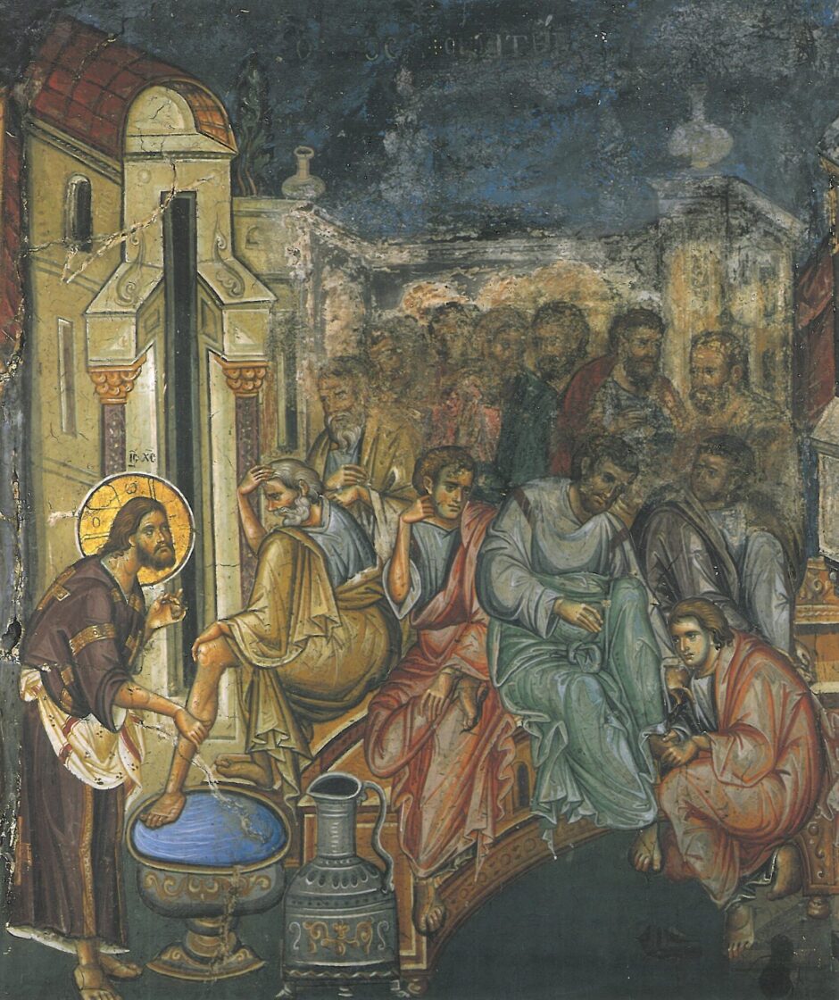Μυστικός Δείπνος και Νιπτήρ. Τοιχογραφία στον εξωνάρθηκα της Ιεράς Μεγίστης Μονής Βατοπαιδίου. Τη αγία και Μεγάλη Πέμπτη «Τη αγία και Μεγάλη Πέμπτη, οι τα πάντα καλώς διαταξάμενοι θείοι Πατέρες, αλληλοδιαδόχως εκ τε των θείων αποστόλων, και των ιερών Ευαγγελίων, παραδεδώκασιν ημίν τέσσαρά τινα εορτάζειν, τον ιερόν Νιπτήρα, τον Μυστικόν Δείπνον (δηλαδή την παράδοσιν των καθ’ ημάς φρικτών Μυστηρίων), την υπερφυά Προσευχήν, και την Προδοσίαν αυτήν». Αυτά στον λιτό και συνοπτικό Συναξαριακό λόγο της εκκλησίας. Με τους στίχους που ακολουθούν, απόσταγμα της ποιητικής μεγαλοσύνης. Της ακρίβειας του ακαριαίου εκκλησιαστικού λόγου. «Στίχοι εις τον Ιερόν Νιπτήρα Νίπτει Μαθητών εσπέρας Θεός πόδας, Ου πους πατών ην εις Εδέμ δείλης πάλαι. Εις τον Μυστικόν Δείπνον Διπλούς ο Δείπνος, Πάσχα γαρ νόμου φέρει, Και Πάσχα καινόν, Αίμα. Σώμα Δεσπότου. Εις την υπερφυά Προσευχήν Προσεύχη, και φόβητρα, ...