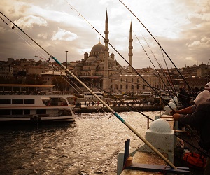 Τα υπέροχα καλκάνια ψαρεύονται γύρω από το στόμιο του Ευξείνου κατά τον Μάρτιο και οι γλώσσες τον Μάϊο και τον Ιούνιο. Ο Ιούλιος έχει να κάνη με τις σαρδελλοφρίσσες και με την τέρψι της θέας των πυροφανιών. Αλλ’ ο Σεπτέμβριος, αυτός ο πανευτυχής μήνας του Βοσπόρου φέρνει μαζί με τα ορτύκια και τα γοφάρια. Τότε το ψάρεμα παίρνει την μορφή γιορτής. Επειδή τότε το ψάρεμα γίνεται την νύχτα, συμμετέχει και το ωραίο φύλλο. Πόσα τρυφερά χέρια πόνεσαν από την τραχύτητα και κάποτε κάποτε -αν και σπανίως είναι η αλήθεια- από το ευχάριστο βάρος της πετονιάς! Πόσα χτυποκάρδια, όταν το πονηρό ψάρι κτυπά με την ουρά του το αγκίστρι γιατί υποπτεύεται την δολιότητά του! Αλλά και πόση απελπισία, όταν το ψάρι φθάση σχεδόν ...