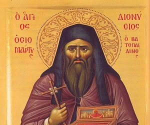 Ο άγιος νέος οσιομάρτυς Διονύσιος ο Βατοπαιδινός (+1822). Φορητή εικόνα στο παρεκκλήσιο της Αγίας Ζώνης της Ιεράς Μεγίστης Μονής Βατοπαιδίου Υπήρξαν μοναχοί της ιεράς μονής Βατοπαιδίου. Το 1820 απεστάλησαν οι ιερομόναχοι Νεόφυτος και Αμβρόσιος, ο Ιεροδιάκονος Παρθένιος και οι μοναχοί Διονύσιος και Δωρόθεος και αργότερα ο Μακάριος στην Κρήτη, κατόπιν προσκλήσεως, με τίμια λείψανα, προκειμένου να εκδιωχθεί η φοβερή ασθένεια της πανώλης, η οποία μάστιζε τους κατοίκους του νησιού. Αυτά ήταν, μέρος της Τιμίας Ζώνης της Θεοτόκου, δώρο στη μονή του αυτοκράτορα Ιωάννου Καντακουζηνού, τεμάχιο Τιμίου Ξύλου και η κάρα του αγίου Ανδρέου Κρήτης. Άπό τή διήγηση του μοναχού Αρσενίου Παντοκρατορινού, που αντεγράφη στις 25 Ιουνίου 1932 και σώζεται στη μονή Βατοπαιδίου, πληροφορούμεθα πώς η μονή απέστειλε στό Μεγάλο Κάστρο της ...