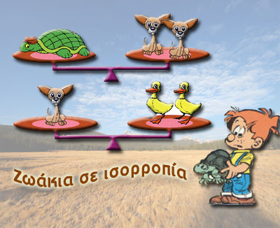 Για μαθητές της Β΄ και Γ΄ τάξης Πόσα παπάκια πρέπει να ανεβούν στον άδειο δίσκο της ζυγαριάς, για να ισορροπήσουν τη χελωνίτσα; Σ΄ αυτό το πρόβλημα σύγκρισης πρέπει να σκεφτείς λογικά και να βρεις τις ισορροπίες μεταξύ όλων των ζώων. Πόσα παπάκια πρέπει να υπάρχουν στον δίσκο της ζυγαριάς με το ερωτηματικό; Γράψε στο κίτρινο πλαίσιο τον αριθμό τους.