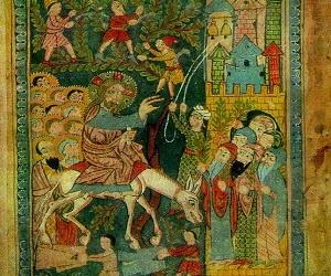 Στη σημερινή ευαγγελική περικοπή περιγράφεται η αποκαλούμενη θριαμβευτική είσοδος του Ιησού στα Ιεροσόλυμα. Από όλη τη διήγηση γίνεται σαφές ότι η είσοδος του Ιησού στην αγία πόλη είναι θριαμβευτική για την Εκκλησία. Μόνον με την πίστη και την καθοδήγηση του Αγίου Πνεύματος η είσοδος του καταδιωκόμενου από τους άρχοντες του Ισραήλ προφήτου αποβαίνει θριαμβευτική μετάβαση του Μεσσία στη δόξα του. Πηγή:http://www.armsite.com/ Η διήγηση δίδει την εντύπωση αποσπάσματος ημερολογίου κινήσεως του Ιησού και των περί αυτόν. Η «επαύριον» είναι η 10η Νισάν, δηλ. η Δευτέρα. Η είδηση της ελεύσεως του Ιησού στα Ιεροσόλυμα διεγείρει τα πνεύματα, ιδιαίτερα μεταξύ των επαρχιωτών —κυρίως Γαλιλαίων— προσκυνητών, οι οποίοι διατηρούσαν εντονότερη την μεσσιακή ελπίδα, περισσότερο γιατί το Πάσχα με την ανάμνηση της λυτρώσεως από τη δουλεία ...
