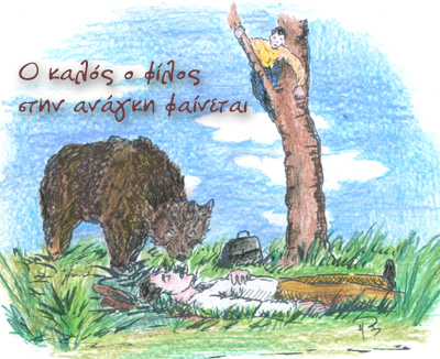 Κάποτε δυο φίλοι ταξίδευαν. Τα πράγματα όμως ήρθαν ανάποδα και έχασαν τον δρόμο τους. Έτσι χάθηκαν μέσα σ΄ ένα μεγάλο δάσος. - Μη στενοχωριέσαι, είπε ο νεότερος. Ό,τι και να γίνει είμαστε μαζί, ομάδα… Άλλωστε δε μπορεί, σε λίγο θα βρούμε το μονοπάτι που μας οδηγεί στον κεντρικό δρόμο για την κοντινότερη πόλη. Τα λόγια του φίλου ήταν παρήγορα αλλά και το σκοτάδι άρχισε να πέφτει πυκνό. Σαν να μην έφταναν οι δυσκολίες τους, σε λίγο, πίσω από μια συστάδα δέντρων παρουσιάστηκε μπροστά τους μια αρκούδα! Ο νεότερος χωρίς δεύτερη κουβέντα εγκατέλειψε τον φίλο του με τη μία και γρήγορα σκαρφάλωσε σ΄ ένα δέντρο και κρύφτηκε στα πυκνά κλαδιά του. Ο μεγαλύτερος σε ηλικία κατάλαβε πως δεν πρόφταινε πια να φύγει… Έπεσε ...