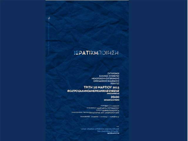 «Όπου υπάρχει ποίηση, εκεί κι ο Θεός», έχει πει ο Οδυσσέας Ελύτης. Κι αυτό δικαιώνεται απόλυτα στην Ιερατική Ποίηση. Με τον όρο Ιερατική Ποίηση εννοούμε την ποίηση που γράφουν σήμερα κληρικοί της Ορθόδοξης Εκκλησίας. Η ποίηση αυτή δεν είναι κατ' ανάγκην θρησκευτική. Πρόκειται για ποίηση κυρίως υπαρξιακή. Από την ποίηση αυτή, όπως είναι λογικό, δεν απουσιάζει ο Θεός, αλλά Αυτός νοείται ως αέναη αναζήτηση και ως Ον που νοηματοδοτεί την ύπαρξη. Το Πρόγραμμα Μουσικής του Hellenic American College, σε συνεργασία με το Hellenic American University και το Καλλιτεχνικό Σύνολο «Πολύτροπον», παρουσιάζουν την Τρίτη 10 Μαρτίου 2015, στις 20:00 μ.μ., στο Θέατρο της Ελληνοαμερικανικής Ένωσης, (Μασσαλίας 22, Κολωνάκι), εκδήλωση αφιερωμένη στην Ιερατική Ποίηση, με τραγούδια για φωνή και πιάνο σύγχρονων Ελλήνων συνθετών, ...
