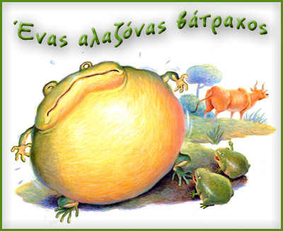 - Πατέρα, πατέρααααα! Τα βατραχάκια πηδούσαν αλαφιασμένα από ενθουσιασμό, κουνώντας τα μακριά πρασινωπά χέρια τους. - Εεε, ήρεμα παιδιά μου, τι πάθατε; O βατραχοπατέρας προσπαθούσε να βάλει τάξη στη βατραχοπαρέα του φουσκώνοντας το σαγόνι του και απλώνοντας τα βατραχοχέρια του στα κεφαλάκια των μικρών του που δε σταματούσαν. - Δεν μπορείς να φανταστείς πατέρα, τι είδαμε! - Είδαμε το μεγαλύτερο τέρας του κόσμου…. Και γούρλωναν τα βατραχομάτια τους….. - Πατέρα, ήταν πελώριο, με κέρατα στο κεφάλι, ουρά μακριά και τόσοοοοο χοντρά πόδια…. Θα μας έλιωναν, αν μας πατούσαν…! - Σιγά παιδιά μου, σιγά μην ήταν τέρας! Ήταν απλούστατα ένα βόδι, είπε με σοφό ύφος ο βατραχοπατέρας. - Κοιτάξτε με προσεκτικά, συνέχισε, πώς θα γίνω κι εγώ τώρα μεγάλος σαν βόδι. Τα βατραχοπαιδάκια του τον κοιτούσαν με τα τεράστια βατραχίσια μάτια ...