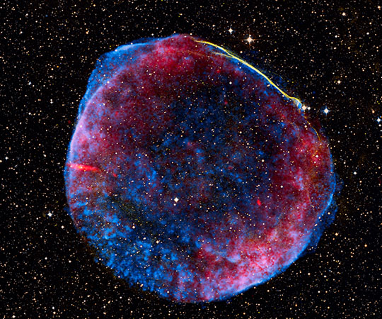 SN 1006 Supernova Remnant: ίσως ο μεγαλύτερος υπερκαινοφανής που έχει καταγραφεί ποτέ (φωτ. NASA) Η εξέλιξη του αστέρα (μεταβολές των φυσικών χαρακτηριστικών του με τον χρόνο), αν και οφείλεται στις εναλλαγές των πυρηνικών αντιδράσεων του εσωτερικού του, καθορίζεται κυρίως από την αρχική μάζα του αστέρα. Οι φάσεις που περνά ένας αστέρας από τη δημιουργία μέχρι την καταστροφή του περιγράφονται στο άρθρο που ακολουθεί. 1) Πρώτη φάση: Η αρχική ύλη από την οποία αποτελείται o πρωτοαστέρας καταρρέει βαρυτικά, με συνέπεια να ξεκινούν οι πυρηνικές αντιδράσεις στο εσωτερικό του. 2) Φάση Κύριας Ακολουθίας: Είναι η μεγαλύτερη σε διάρκεια φάση ζωής του άστρου. Το άστρο βρίσκεται στην Κύρια Ακολουθία του διαγράμματος Hertzsprung-Russell (H-R diagram) και στο εσωτερικό του γίνονται πυρηνικές αντιδράσεις καύσης του υδρογόνου (Η). ...