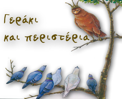 Ένα γεράκι κάποτε είχε βάλει στο μάτι ένα κοπάδι περιστέρια. Προσπάθησε πολλές φορές να τα πιάσει ορμώντας πάνω τους, μα εκείνα πρόφταιναν να χωθούν στον περιστερώνα τους. - Μάλλον βλέπουν τη σκιά μου, όταν πέφτω πάνω τους κι έτσι προλαβαίνουν και κρύβονται. Αλλά και τη μέρα που είχε συννεφιά και περίμενε πως δε θα μπορούν να το καταλάβουν, τα περιστέρια μας κρύφτηκαν μια χαρά στο σπιτάκι τους και η επίθεση πήγε τζάμπα και πάλι. Η πείνα όμως του γερακιού μεγάλωνε και μαζί μεγάλωνε κι η πονηριά του. - Τι κάθομαι και παιδεύομαι με επιθέσεις, σκέφτηκε και μονολογούσε! Θα γίνω βασιλιάς τους και τότε θα έχω στο στομάχι μου όσα περιστέρια θέλω. Πράγματι, ανέβηκε στην κορυφή ενός δέντρου κοντά στον περιστερώνα και φώναξε στα περιστέρια: - Γιατί ...