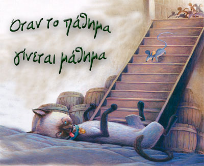- Γέμισε ποντικούς το σπίτι! Αλωνίζουν στην κουζίνα τα βράδια... Άσε που τους ακούω να ροκανίζουν τα σανίδια της οροφής, χρατς, χρουτς, με τρελαίνουν όλη νύχτα… Ο κυρ Θόδωρος άκουγε την τρομαγμένη γυναίκα του μην ξέροντας τι να κάνει, μιας και οι ποντικοί του σπιτιού του ήταν τόσο πονηροί, που σε καμιά ποντικοπαγίδα, απ΄ αυτές που είχε στήσει, δεν πιανόντουσαν. - Έννοια σου, χαμογέλασε πονηρά, βρήκα τον μάστορά τους! Και ο κυρ Θόδωρος, στ’ αλήθεια, είχε βρει τον κατάλληλο «κυνηγό- εξολοθρευτή»: έναν καλοθρεμμένο γάτο! Πράγματι, με το που μπήκε μέσα στο σπίτι, τους τρέλανε τους ποντικούς στο κυνήγι! Οι περισσότεροι ποντικοί έγιναν λαχταριστός μεζές του ψιψινόγατου. - Δεν πάει άλλο αδέλφια, είπε στο συμβούλιο των ποντικών ο πρόεδρος Ποντικίδης. Όποιος μυρίζεται πρώτος τον γάτο, θα ...