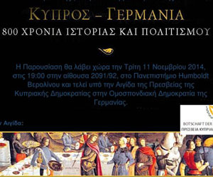 Το Τµήµα Κλασσικής Αρχαιολογίας του Πανεπιστηµίου Humboldt Βερολίνου, η Γερµανοελληνική Εταιρεία Βερολίνου και ο Σύνδεσµος Υποτρόφων Ιδρύµατος Α. Γ. Λεβέντη Κύπρου, θα παρουσιάσουν τη δίγλωσση (Ελληνικά – Γερµανικά) έκδοση: “Κύπρος–Γερµανία 800 Χρόνια Ιστορίας και Πολιτισµού” της Εταιρείας Κυπριακών Σπουδών και του Συνδέσµου Υποτρόφων Ιδρύµατος Α. Γ. Λεβέντη Κύπρου. Η παρουσίαση θα λάβει χώρα την Τρίτη 11 Νοεµβρίου 2014, στις 19:00 στην αίθουσα 2091/92, στο Πανεπιστήµιο Humboldt Βερολίνου και τελεί υπό την Αιγίδα της Πρεσβείας της Κυπριακής ∆ηµοκρατίας στην Οµοσπονδιακή ∆ηµοκρατία της Γερµανίας. Das Institut für klassische Archäologie der Humboldt Universität Berlin, die Deutsch-Griechische Gesellschaft Berlins und der Leventis Stipendiaten-Verein zu Zypern laden Sie zur Buchpräsentation der zweisprachigen (Griechisch-Deutsch) Publikation: “Zypern-Deutschland, 800 Jahre Geschichte und Kultur” Die Veranstaltung findet am Dienstag den 11. November 2014 um ...