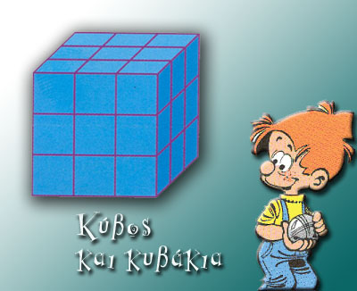 Για μαθητές Γ΄ και Δ΄ τάξης Ένας κύβος με πλευρά μήκους 3 cm βάφεται γκρίζος εξωτερικά. Μετά ο κύβος κόβεται σε μικρότερους κύβους, ο καθένας από τους οποίους έχει πλευρά μήκους 1 cm, όπως δείχνει το σχήμα. Πόσοι από αυτούς τους μικρότερους κύβους έχουν ακριβώς δύο έδρες τους βαμμένες γκρι; Πρώτα συλλογίσου πόσοι είναι οι κύβοι ακμής 1 cmπου είναι εξωτερικοί. Πόσοι από αυτούς έχουν μόνο δύο έδρες ορατές. Γράψε τον αριθμό των κύβων στο γαλάζιο τετραγωνάκι.