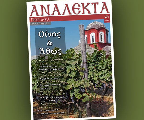 «Εγώ ειμι η άμπελος η αληθινή και ο πατήρ μου ο γεωργός εστιν» ( Ιω. 15,1). Με την παρουσία του Χριστού στον κόσμο και την παράδοση της Θείας Ευχαριστίας προ του Θείου Πάθους Χριστιανισμός και Οίνος συμπορεύονται άρρηκτα. Ο Οίνος αποτελεί αναπόσπαστο μέρος των Τιμίων Δώρων αποτελώντας μετά τον καθαγιασμό το Τίμιο Αίμα που μεταλαμβάνουν οι πιστοί. Η Χερσόνησος του Άθω, ήταν από αρχαιοτάτων χρόνων, παρά την αγριότητα του τοπίου της, ένας ευλογημένος αμπελότοπος. Ο Όσιος Αθανάσιος ο Αθωνίτης συντάσσοντας τον καταστατικό χάρτη του Αγίου Όρους ορίζει πως κάθε μονή οφείλει να έχει τον δικό της αμπελώνα. Από τότε η οργανωμένη αμπελοκαλλιέργεια υπάρχει συνεχώς και αδιαλείπτως για πάνω από μία χιλιετία στο Άγιο Όρος, το Περιβόλι της Παναγιάς. Ποικιλίες αμπέλου, μικροκλίματα, ιδιαίτερες ...