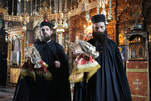 Στην ακολουθία του Όρθρου ψάλεται ο Πολυέλαιος «Δούλοι Κύριον» έρρυθμα για να ταιριάζει η ψαλμωδία με την κίνηση του κατζίου,του θυμιατού με το οποίο θυμιάζουν οι μοναχοί που έχουν το διακόνημα του εκκλησιαστικού. Το κατζίο είναι φορητό και χρησιμοποιείται στις λατρευτικές συνάξεις εντός του ναού όταν ψάλλονται ύμνοι από την Παλαιά Διαθήκη ή αναγινώσκονται οι Μεγάλες Ώρες. Είναι μεταλλικό με μακριά χειρολαβή και κουδούνια, τα οποία συμβολίζουν τα βήματα του Θεού στον Παράδεισο και προτρέπουν τους μοναχούς σε εγρήγορση :'''Και άκουσαν τη φωνή του Κυρίου του Θεού, να περπατάει στον παράδεισο προς το δειλινό'' (Παλαιά Διαθήκη Γένεση Κεφ. 3, Στίχος 8.. Όταν οι εκκλησιαστικοί θυμιάζουν με το κατζίο φέρουν στον ώμο τους ένα τετράγωνο ύφασμα που λέγεται ''αήρ'' ΄ συνήθως είναι χρυσοποίκιλτο και ...