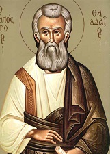 Ο άγιος απόστολος Θαδδαίος καταγόταν από την Έδεσσα της Μεσοποταμίας και κατά το γένος ήταν Εβραίος. Είχε μελετήσει πολύ της θείες Γραφές (τα βιβλία της Παλαιάς Διαθήκης) και γνώριζε σε βάθος το περιεχόμενό τους. Ο Θαδδαίος πήγε στα Ιεροσόλυμα κατά της ήμερες του Ιωάννη του Βαπτιστή, για να προσκυνήσει. Εκεί άκουσε το κήρυγμα του Ιωάννη και, αφού υπερθαύμασε την αγγελική του ζωή, του ζήτησε και τον βάπτισε. Κατόπιν, όταν είδε τον Ιησού Χριστό και τα άπειρα θαύματα, που Αυτός επιτελούσε, και άκουσε τη διδασκαλία Του, ακολούθησε Αυτόν μέχρι το σωτήριο Πάθος. Μετά την Ανάληψη του Κυρίου ο Θαδδαίος επέστρεψε στην πόλη του, την Έδεσσα. Εκεί εβάπτισε τον τοπάρχη Αύγαρο και του θεράπευσε τω μικρό μέρος της λέπρας που του είχε απομείνει στο ...