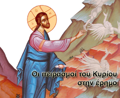 Μετά τη Βάπτιση ο Ιησούς οδηγήθηκε από το Πνεύμα το Άγιο στην έρημο, στο βουνό Σαραντάριο. Νήστεψε σαράντα ημέρες και νύχτες κι ύστερα πείνασε. Τότε του παρουσιάστηκε ο διάβολος για να τον πειράξει. «Αν είσαι Υιός του Θεού, πες σ’ αυτές τις πέτρες να γίνουν ψωμιά», του είπε κι ο Ιησούς του απάντησε: «Ο άνθρωπος δεν θα ζήσει μόνο με το ψωμί, αλλά και με τον λόγο του Θεού». Ύστερα ο διάβολος τον πήρε και τον έφερε στην πόλη την αγία, την Ιερουσαλήμ, στην άκρη της στέγης του Ναού και του είπε: «Αν είσαι Υιός του Θεού πέσε κάτω. Να δούμε, θα διατάξει ο Θεός τους αγγέλους του να σε σηκώσουν στα χέρια, ώστε να μη χτυπήσεις στις πέτρες, όπως λένε ...
