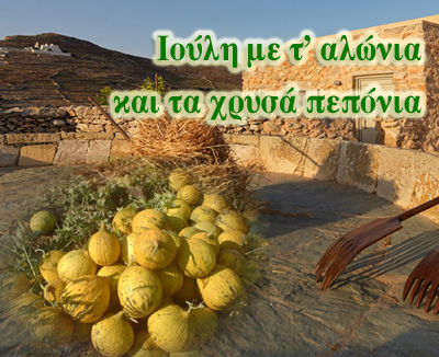 Έχουμε μπει για τα καλά στο καλοκαίρι. Τα σχολεία έκλεισαν πριν από 15 μέρες και κάποιοι βρίσκονται ήδη στα βουνά και στη θάλασσα. Οι πόλεις της χώρας μας αδειάζουν, κάτι που θα συνεχισθεί και τον επόμενο μήνα. Τα χωριά ξαναπαίρνουν ζωή και όλα εσείς τα παιδιά έχετε πολύ χρόνο στη διάθεσή σας, τον οποίο πρέπει να εκμεταλλευτείτε κατάλληλα. Ο Ιούλιος είναι από τους θερμότερους μήνες του χρόνου κι ο λαός μας τον αποκαλούσε «Αλωνάρη» ή «Αλωνιστή». Κι αυτό, επειδή τα δημητριακά που είχαν θεριστεί τον προηγούμενο μήνα τώρα πρέπει να ξεχωρίσουν τα στάχυα από τον καρπό. Αυτή η εργασία λεγόταν αλώνισμα. Γινόταν με τη βοήθεια των ζώων, που έκαναν συνεχώς κύκλους μέσα στο αλώνι. Το γλυπτό της εικόνας παριστάνει τον Ιούλιο να ...