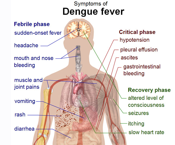 Δάγκειος αιμορραγικός πυρετός (Dengue Hemorrhagic Fever) και σύνδρομο καταπληξίας από Δάγκειο (Dengue Shock Syndrome): Η πιο σοβαρή -και πιθανά θανατηφόρος- μορφή της νόσου εμφανίζεται με τη μορφή του Δάγκειου αιμορραγικού πυρετού, ο οποίος σε μερικούς ασθενείς εξελίσσεται σε σύνδρομο καταπληξίας. Η κλινική εικόνα της πρώιμης φάσης του Δάγκειου αιμορραγικού πυρετού είναι παρόμοια με την εικόνα του Δάγκειου πυρετού και είναι δύσκολο να διακριθούν οι δύο εικόνες στα πρώιμα στάδια της νόσου. Υπάρχουν τρεις φάσεις του Δάγκειου αιμορραγικού πυρετού: i. Η φάση του εμπύρετου, με εικόνα που μπορεί να μοιάζει με του Δάγκειου πυρετού. Μπορεί να συνυπάρχουν ήπιες αιμορραγικές εκδηλώσεις (πετέχειες, αιμορραγίες βλεννογόνων) και διόγκωση και ευαισθησία του ήπατος. Πιο σπάνια μπορεί να συμβεί, σε αυτή τη φάση, μαζική μηνορραγία και αιμορραγία γαστρεντερικού ...