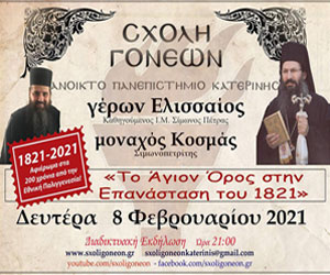 Η Σχολής Γονέων – Ανοικτό Πανεπιστήμιο Κατερίνης στο πλαίσιο του αφιερώματος της για τα 200 χρόνια από την Ελληνική Επανάσταση, πραγματοποιεί Δευτέρα 8-2-2012 στις 21:00 ομιλία με θέμα: «Το Άγιον Όρος στην Επανάσταση του 1821» με ομιλητή τον γραμματέα της Ιεράς Επιστασίας του Αγίου Όρους μοναχό Κοσμά Σιμωνοπετρίτη ο οποίος θα αναγνώσει την ομιλία του καθηγουμένου της Ι.Μ. Σίμωνος Πέτρας π. Ελισσαίου.