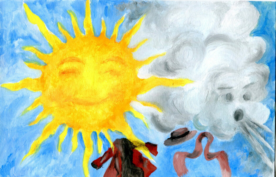 Κάποτε ο Ήλιος κι ο Βοριάς μάλωναν για το ποιος είναι ο πιο δυνατός. Ο Βοριάς ισχυριζόταν πως δεν χωράει αμφιβολία πως αυτός είναι ο πιο δυνατός. Όταν βάζει όλη του τη δύναμη σηκώνει βουνό τα κύματα στη θάλασσα, γκρεμίζει σκεπές, σπάζει κλαδιά και ξεριζώνει ολόκληρα δέντρα, ξεσχίζει τα θερμοκήπια, αναγκάζει ανθρώπους και ζώα να αναζητήσουν καταφύγιο, γιατί δεν αντέχουν να σταθούν απροστάτευτοι στην παγωμένη αγριάδα του. Ο Ήλιος βέβαια πίστευε στη δική του παντοδυναμία. Ποιος μπορούσε σ΄όλη την πλάση να τον ξεπεράσει; Αυτός ήταν ο βασιλιάς του κόσμου. Χωρίς το δικό του φως και τη δική του θέρμη τίποτα δεν θα υπήρχε. Έπρεπε όμως να βρεθεί μια συγκεκριμένη χειροπιαστή αφορμή, για να αναμετρηθούν οι δυο αντίπαλοι. Και δεν άργησε να βρεθεί… Ένας τσοπάνος ...
