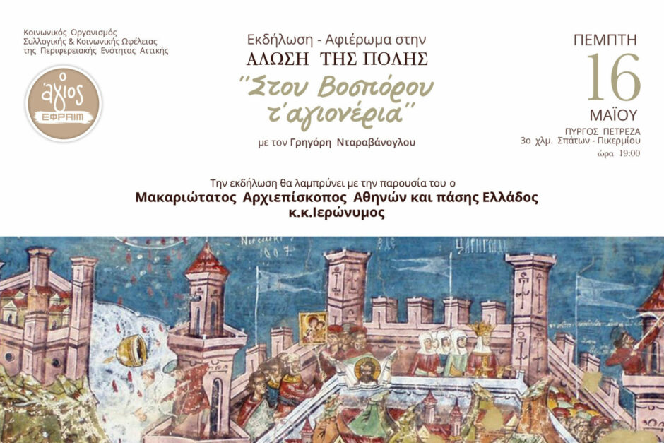 Εκδήλωση – Αφιέρωμα στην Άλωση της Πόλης με τον Γρηγόρη Νταραβάνογλου την Πέμπτη 16 Μαΐου 2019 και ώρα 19:00.