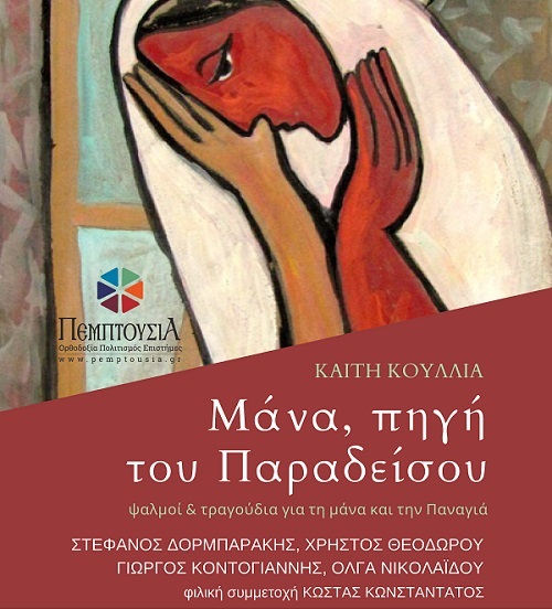 ΔΕΥΤΕΡΑ 15 ΑΠΡΙΛΙΟΥ ΦΙΛΟΛΟΓΙΚΟΣ ΣΥΛΛΟΓΟΣ ΠΑΡΝΑΣΣΟΣ Βλέποντας τότε ένα φως στο πέλαγο… εγώ μάντευα ότι καντήλι ήταν της Παναγιάς Με αφορμή την κυκλοφορία του νέου της δίσκου, με τον τίτλο: «Μάνα, πηγή του παραδείσου, ψαλμοί και τραγούδια για τη μάνα και την Παναγιά» η Καίτη Κουλλιά με τους συνεργάτες της, θα δώσει μια μεγάλη συναυλία στο Φιλολογικό Σύλλογο «Παρνασσός» στην Αθήνα, τη Δευτέρα 15 Απριλίου. Μάνα, η φωνή σου γεννήθηκε με τα λουλούδια η φωνή σου νανουρίζει τα παιδιά της γης μάνα, που χύνεις δάκρυα για τον ήλιο, για τα δέντρα, για τα πουλιά και για τα αθώα παιδιά που σταυρώθηκαν Μια παράσταση που θα φέρει στα χείλη μας τραγούδια των μεγάλων δημιουργών και στίχους ποιητών (Θεοδωράκη, Γκάτσου, Παπαδιαμάντη, Ρίτσου, Κ. Βάρναλη κ.α.), χαρισμένους στη μάνα και στην Παναγιά, ...