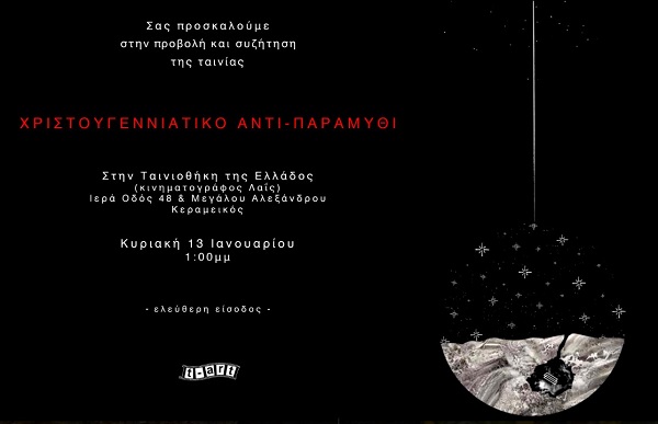 Την Κυριακή 13 Ιανουαρίου, στις 13:00 στην Ταινιοθήκη της Ελλάδος / Greek Film Archive (κινηματογράφος Λαΐς) Ιερά Οδός 48 & Μεγάλου Αλεξάνδρου, Κεραμεικός (Σταθμός μετρό ΚΕΡΑΜΕΙΚΟΣ), θα γίνει προβολή της ταινίας «ΧΡΙΣΤΟΥΓΕΝΝΙΑΤΙΚΟ ΑΝΤΙ-ΠΑΡΑΜΥΘΙ». Θα ακολουθήσει συζήτηση. Η είσοδος είναι ελεύθερη. Διασκευή σεναρίου: + π. Κωνσταντίνος Στρατηγόπουλος Από το διήγημα του: + Ηλία Βουλγαράκη, καθηγητή Θεολογικής Σχολής Εκτέλεση παραγωγής: Viewmaster films Παραγωγή: ΤΕΧΝΑΒΑ Σκηνοθεσία: Ευθύμης Χατζής Μετά την προβολή της ταινίας θα μιλήσουν: – ο Ευθύμης Χατζής, σκηνοθέτης – ο Παναγιώτης Κλειδαράς, υπεύθυνος φωτογραφίας – ο Σύμβουλος στο έργο, Γιώργος Αλεβιζόπουλος – ο Κινέζος ηθοποιός Χάο και – ο Κώστας Γανωτής. Τη συζήτηση θα συντονίσει η Σοφία Χατζή, ραδιοφωνική παραγωγός