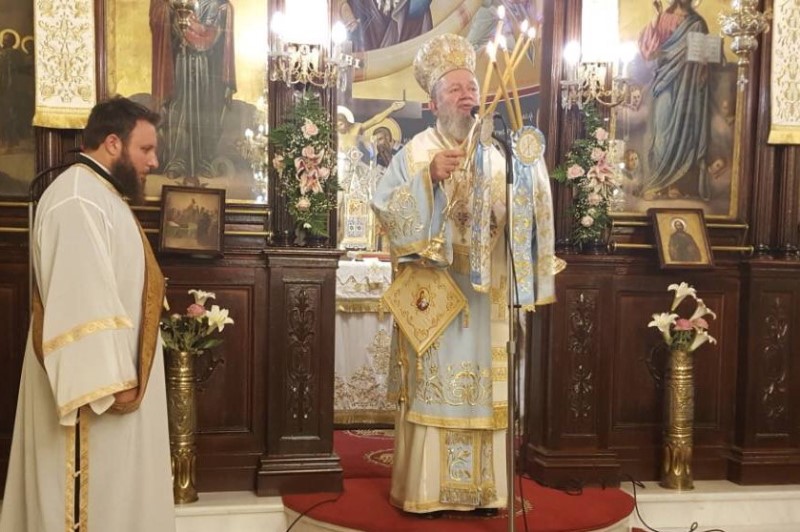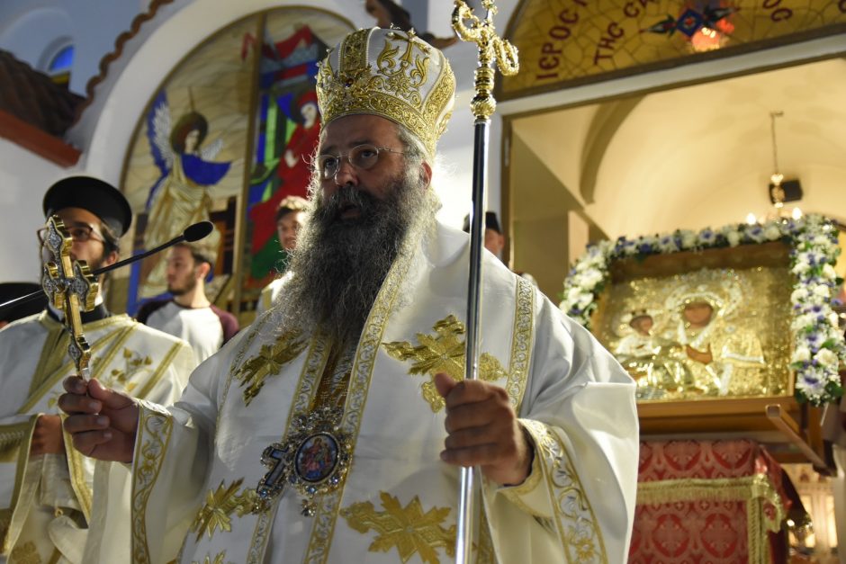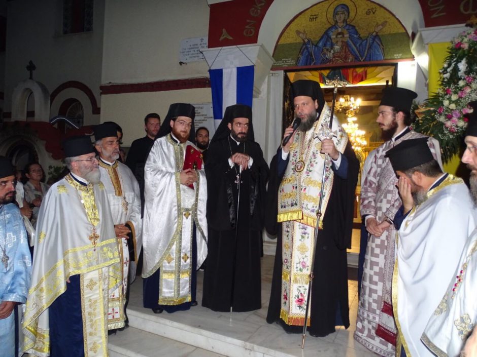 Αγαπητοί πατέρες και αδελφοί, Σήμερα, αυτή τη μεγάλη θεομητορική εορτή της Κοιμήσεως της Θεοτόκου, οι ορθόδοξοι χριστιανοί σε όλο τον κόσμο τιμούν την Παναγία Μητέρα μας. Όπου υπάρχει Εκκλησία του Χριστού, η πονεμένη ψυχή του Χριστιανού γονατίζει εμπρός στην αγία της εικόνα, αποθέτει με εμπιστοσύνη το φορτίο των προβλημάτων της, ευγνωμονεί για τις ευεργεσίες της και ζητάει τις πρεσβείες της. Η Παναγία τιμάται ιδιαιτέρως σήμερα στην Ελλάδα μας. Δεν υπάρχει χωριό η πολιτεία που να μην έχει ναό στο όνομά της, που να μην ακούγονται ύμνοι και ψαλμοί της μεγάλης μας Μητέρας αυτό τον θεομητορικό μήνα του Αυγούστου. Από τότε που οι Έλληνες δέχθηκαν την πίστι του Χριστού έκαναν την Μητέρα Του και δική τους Μητέρα. Την έκαναν πολιούχο στη βασιλίδα των πόλεων, ...